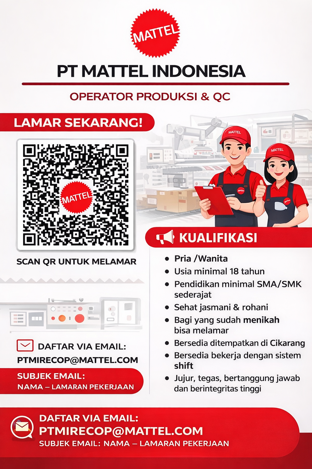 Lowongan Kerja Cikarang Terbaru 2026 – Operator Produksi & QC PT Mattel Indonesia